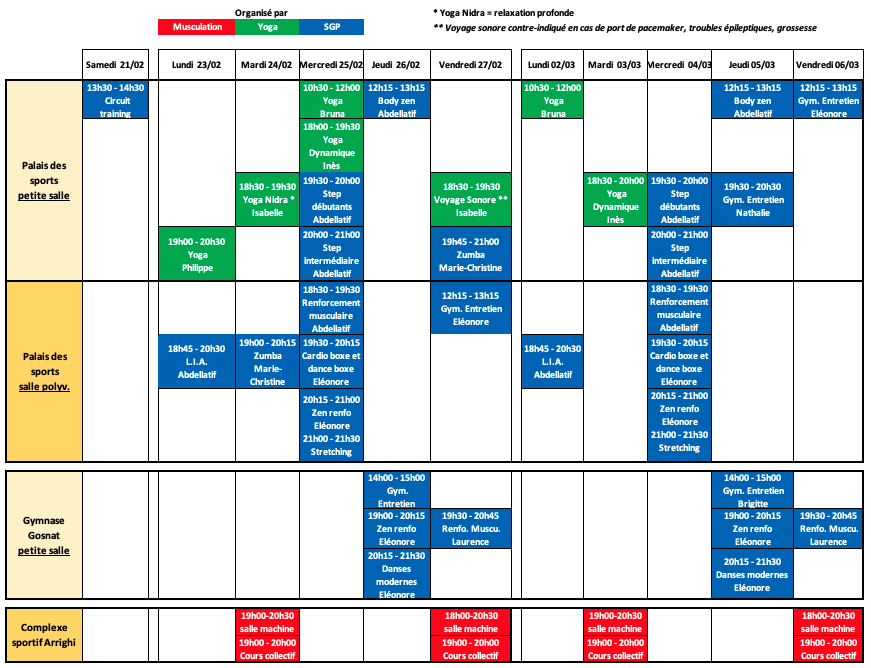 Comme c’est devenu une habitude, nous partageons notre planning avec les sections SGP et musculation, de quoi profiter de vacances sportives pour celles et ceux qui n’iront pas skier !