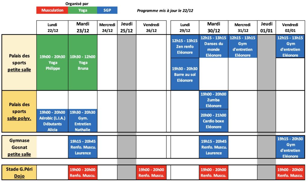 Les congés de fin d’année se profilent. Durant ces 2 semaines, du 22 décembre 2025 au 03 janvier 2026, nous vous proposerons 2 cours de yoga assurés par Philippe et Bruna. Ces cours sont ouverts à tous, quel que soit votre cours de référence. Attention les cours ne seront pas dans les lieux habituels, ils se dérouleront au Palais des Sports (quartier du centre ville).
